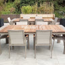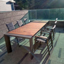 This 7 Piece Dining Set will bedeck the room with a traditional touch. The dining set features eight chairs and one extendable dining table. Simplistic and efficient, the dining table and chairs features a panelled design. Made with teak, its solid wood construction enables years of functionality. Perfect for formal settings, this 9 Piece Dining Set is an excellent addition to your outdoor space.