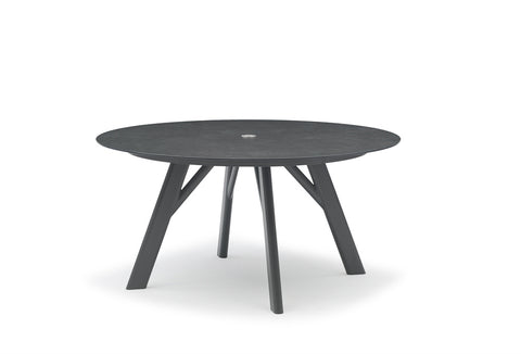 Yes aluminum HPL round table, which looks slim but stable, combines practicality with art, is firm and stable, and is not easy to topple. The middle umbrella hole on the table is convenient for umbrella release.