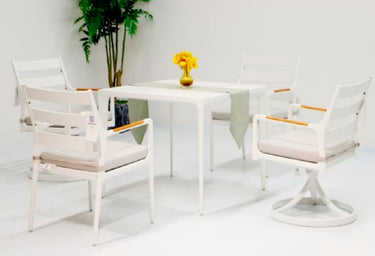 The Cedar series aluminum material structure is durable, thick and sturdy. The dining chair is paired with outdoor teak wood armrests, which are smooth and delicate, with a smooth touch. Paired with Sunbrella seat cushions, it is comfortable and elegant. Desktop snow mountain white Sintered Stone Table Top, waterproof and rainproof, and sunscreen, beautiful and attractive.