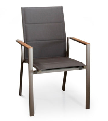 The Montpelier Stacking Chair is made of aluminium and Phifertex® texliline, with teak wood armrests. It's an extraordinary garden chair, with a totally waterproof aluminium frame and a texteline cover. It's also ideal for high-end restaurants. The armrests are made from fine teak wood.