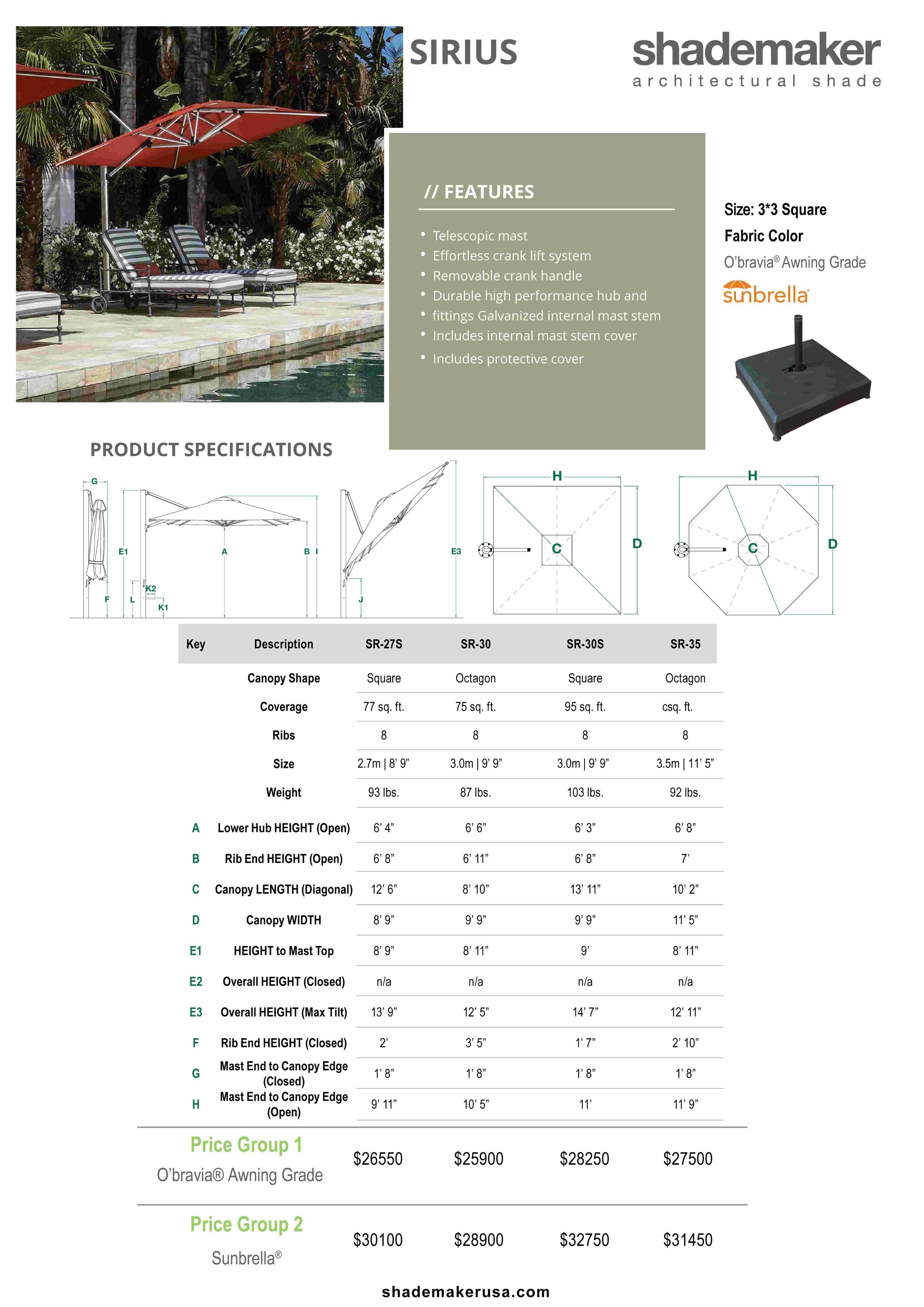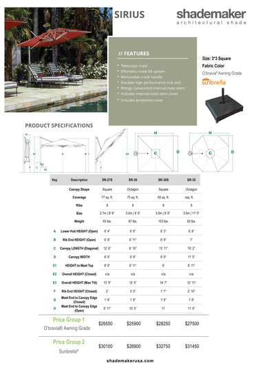 *Pre-order* Shademaker USA Sirius Aluminum 2.7M | 8'9 Square Crank Lift Umbrella