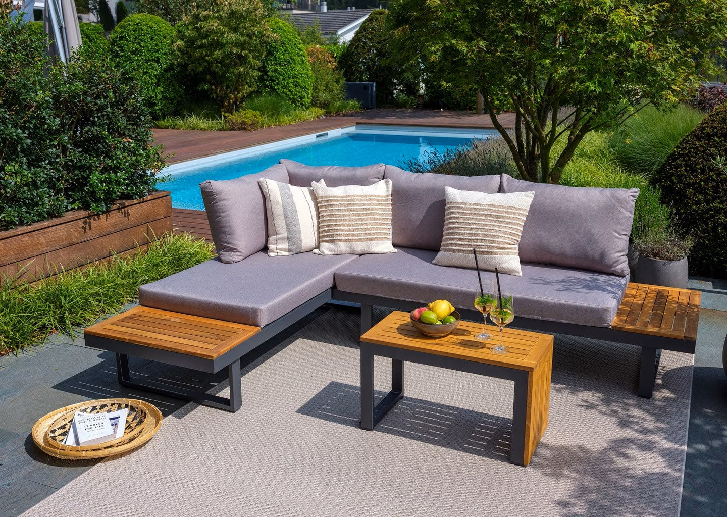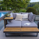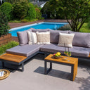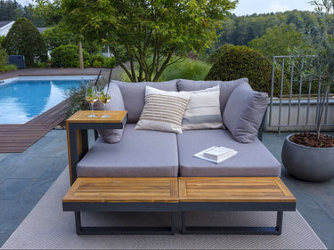 The Sirmione Sofa Set through a proprietary interchangeable design, the backrest and coffee table can be flexibly changed. The backrest can be moved and changed. The coffee table can be used horizontally and vertically. Multiple combinations can meet your needs in different occasions. Aluminum with FSC Acacia Wood Top